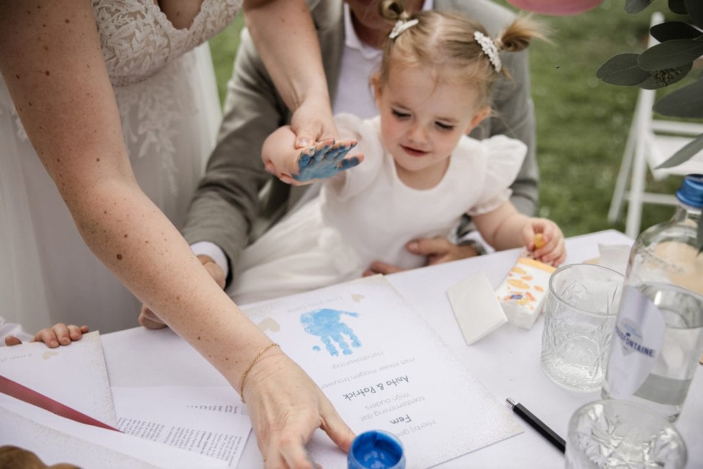 Laat kinderen tekeningen maken voor de ceremonie, of een korte boodschap opschrijven. Misschien willen ze ook wel een soort van geloften uitspreken naar jullie als ouders of oom en tante. Tijdens het ondertekenen van de akte tekenen kinderen soms mee, met bijvoorbeeld gewoon hun naam of als ze nog niet kunnen schrijven met vingerverf bijvoorbeeld. Zo voelen ze zich écht onderdeel van de dag. Op de officiële akte mag dit natuurlijk niet, mocht je dit willen zorg dan dat er een kinderakte is of een ander zelfgemaakt (in de stijl van de uitnodiging bijvoorbeeld) document waarop zij mogen tekenen.