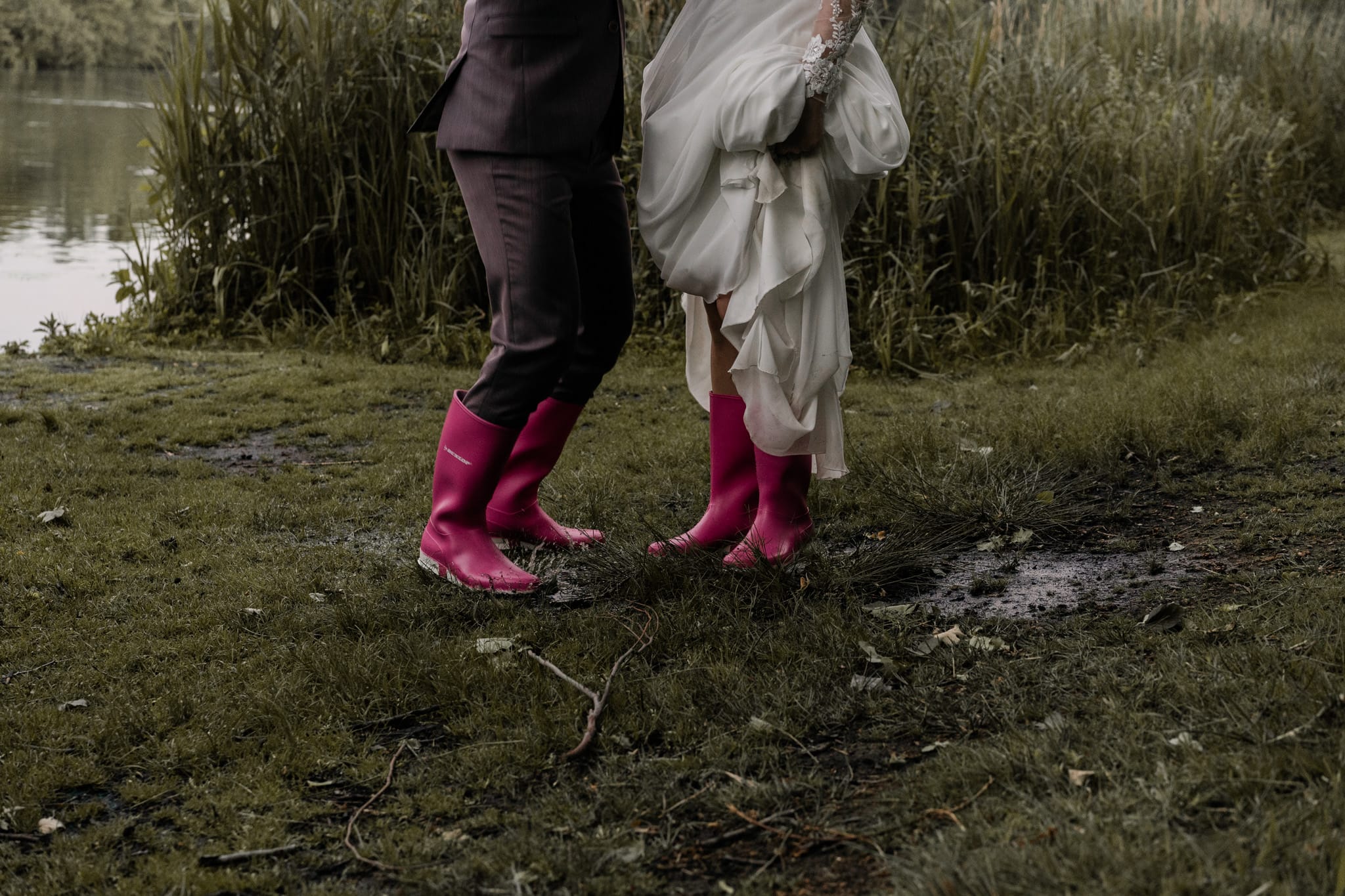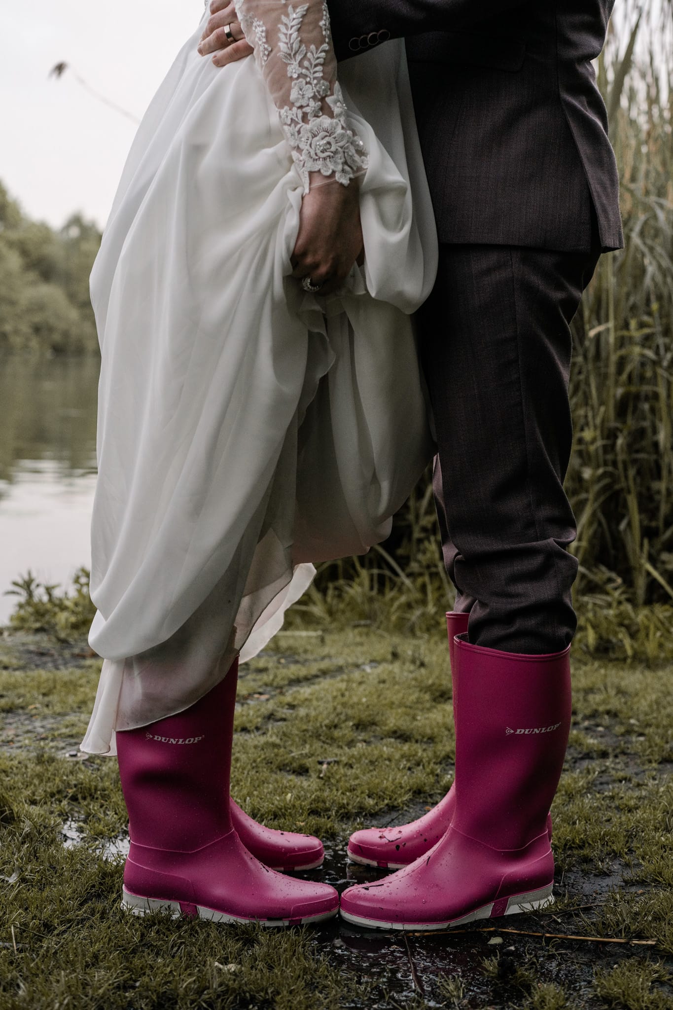 Een paar goede, doorzichtige paraplu’s zijn goud waard. Ze beschermen, zien er stijlvol uit op foto’s én geven een romantisch beeld. Het resultaat? Originele paraplu bruiloft foto’s die je nergens anders krijgt. En waarom geen laarzen voor een korte shoot in de regen? Juist dat soort beelden maken je reportage uniek.